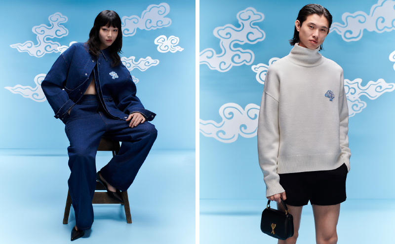 AMI 推出龙年新春胶囊系列,系列包括牛仔单品、T 恤、圆领卫衣、连帽卫衣、针织衫和毛线帽等中性风单品,它们采用了牛仔蓝、浅蓝、黑、白、灰等柔和色彩,并融入了为龙年特别设计的 AMI 爱心标识——标识有两款:被天蓝色和白云环绕,或者缀有祥龙的云朵状 Ami de Coeur。
