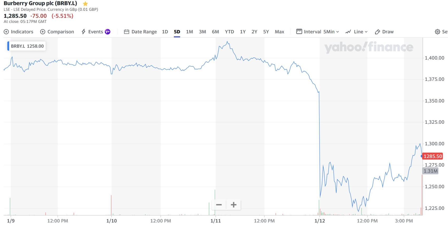 本次财报发布后,Burberry 的股价开盘后急速下跌,盘中曾急跌至1162.5便士/股,较昨日收盘价下跌14.6%,创十年来最大盘中跌幅。随后有所反弹,截至1月12日收盘股价为1285.5便士/股,较昨日收盘价下跌5.51%,创造2020年8月以来最低收盘价,当前市值 48.8亿英镑。