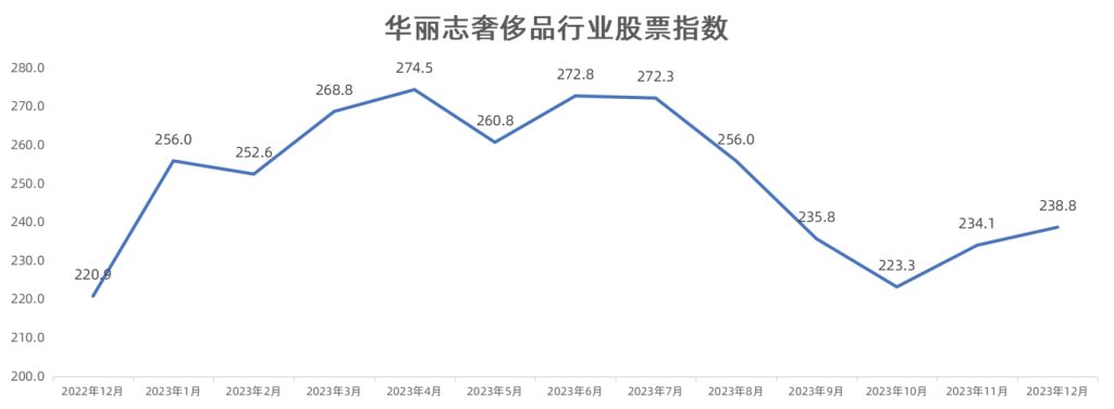 根据「华丽志奢侈品行业股票指数」的记录,奢侈品行业曾在2023年4月份达到历史高点,此后受到美国市场需求放缓,全球经济进一步放缓和利率上升迫使消费者勒紧荷包等因素影响,奢侈品企业股价普遍持续下探,虽然以两连涨收官2023年,该指数仍较去年4月的历史高点下跌了13%。该指数覆盖的26家主要奢侈品,总市值相较历史高点蒸发了超过1600亿美元。