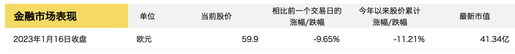 不过由于盈利不及预期,财报发布后,截止1月16日收盘,Hugo Boss 集团的股价较上一交易日下降9.65%,至59.9欧元/股,当前市值约为41亿欧元。