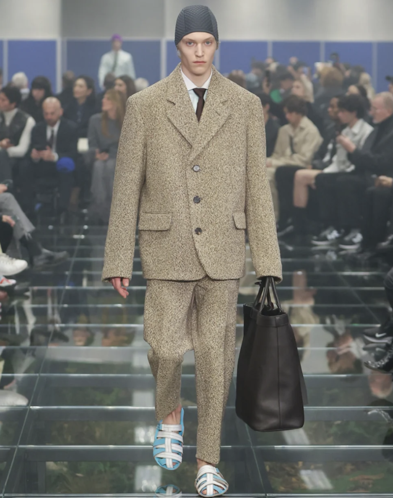 西装、衬衫、大衣是男士衣橱中重要且必不可少的单品,对此 Prada 呈现了多种造型,以满足不同场景的着装需求。比如适用于商务场景的双排扣西装外套、剪裁利落的宽肩大衣;年轻休闲范的粗毛呢西装外套、单宁做的外套,以及领口与袖口处做了撞色拼接的衬衫。