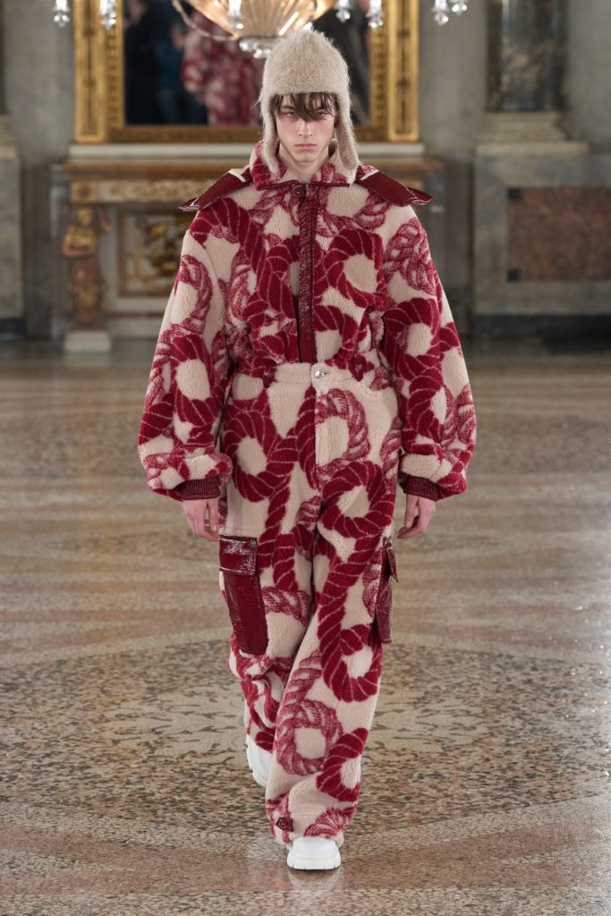 整个系列大胆有趣,且模糊了男女界限。古怪猫脸毛衣、⻓裤和卫衣夸张放大、衬衫扭曲成庞大的袖子、大红色胸针,以及穿着黑色连裤丝袜的男模,Jonathan Anderson 以他个人的视角出发,呈现了艺术性、性感的男性气质。