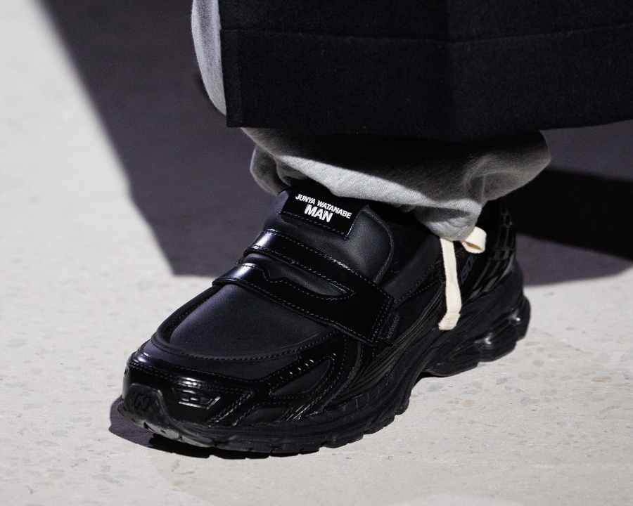 Junya Watanabe MAN 的秀场上展示了和 New Balance 的联名款。这是一双做成了乐福鞋版本的 1906,相当于“挖”掉了 1906 的上半部分鞋身,拼接了乐福鞋的鞋面,外观很有趣,但整体还是保持了和谐。它有带来黑白两个配色。