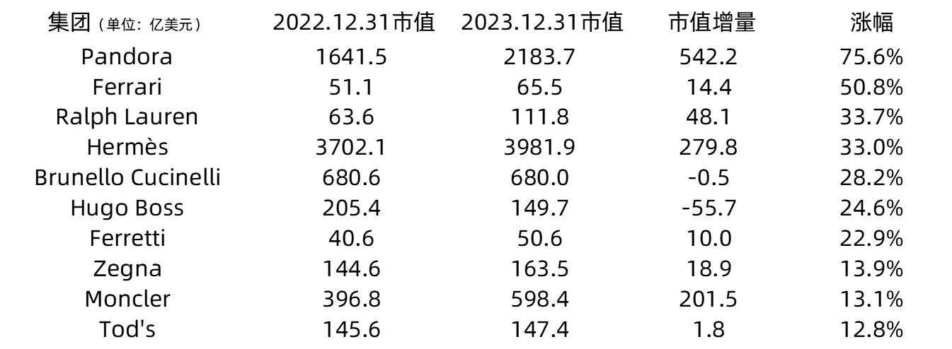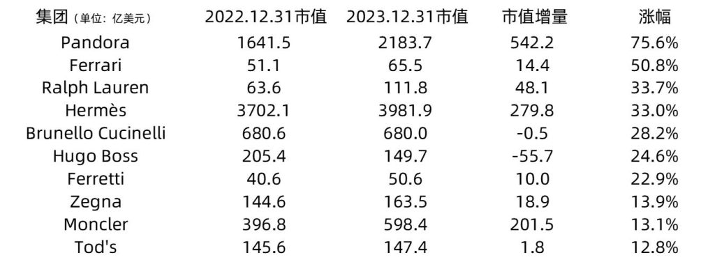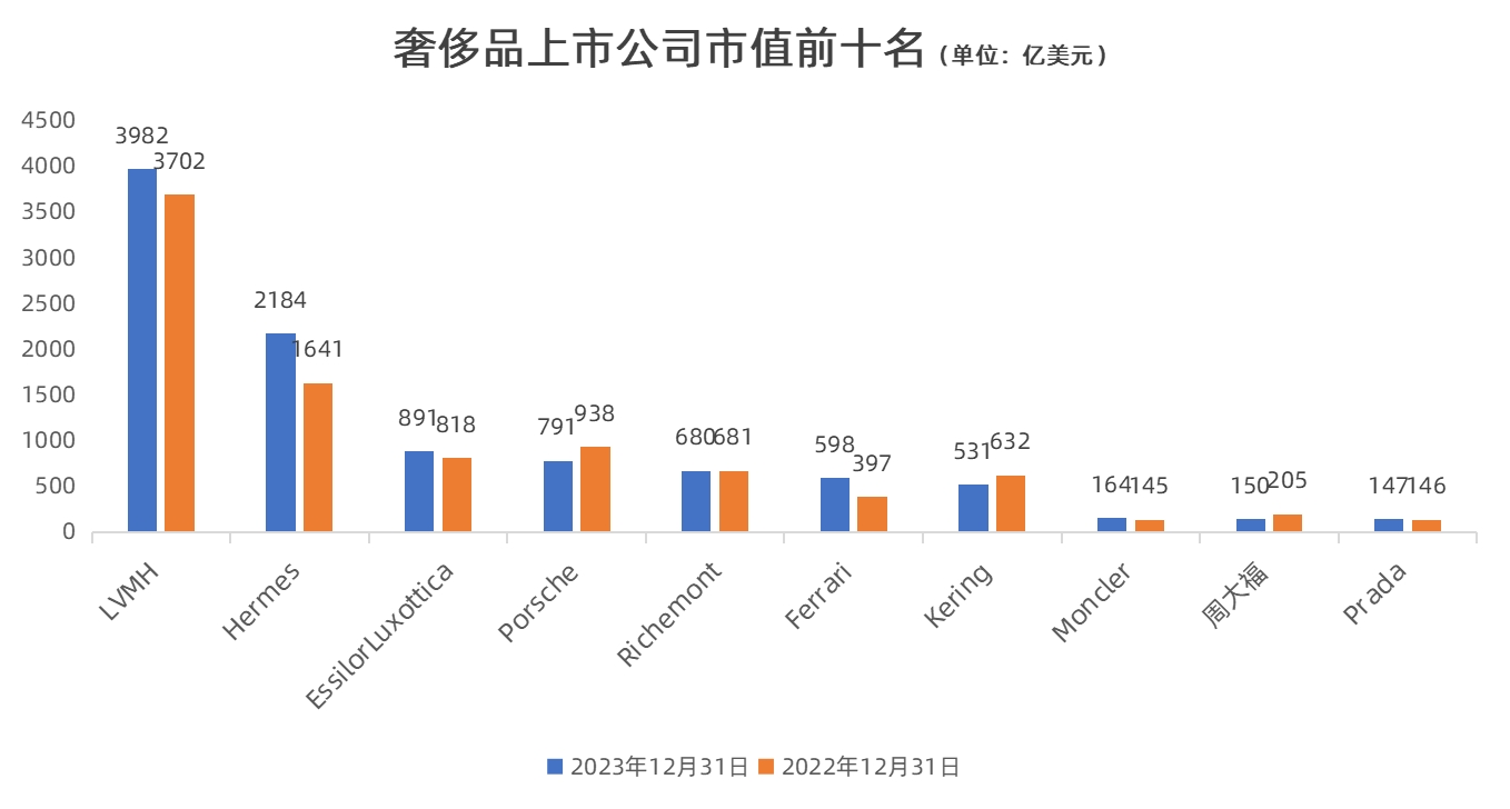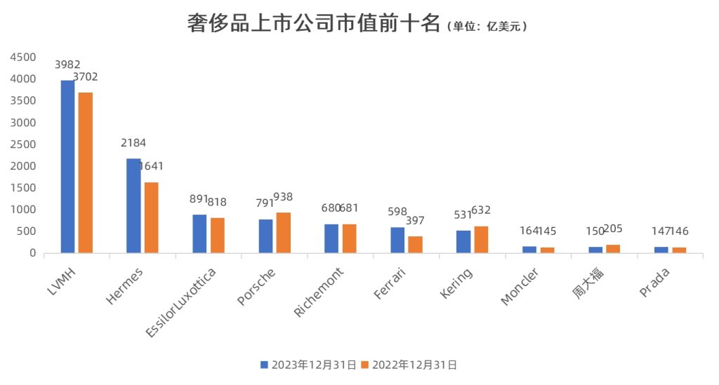 根据截至2023年12月31日的市值,全球排名前十的奢侈品上市公司的如下图所示: