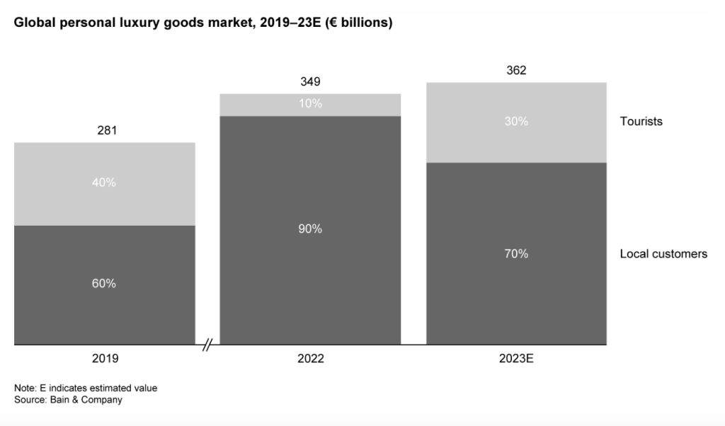 报告还指出,目前,随着2022年底疫情封锁的解除,边境重新开放,旅游业重新焕发活力。从绝对价值来看,游客在奢侈品上的支出几乎回到了疫情前的水平,但所占份额仅为占全球奢侈品购买量的30%,相比2019年的40%,仍有上升潜力,或可恢复至新冠疫情前份额。