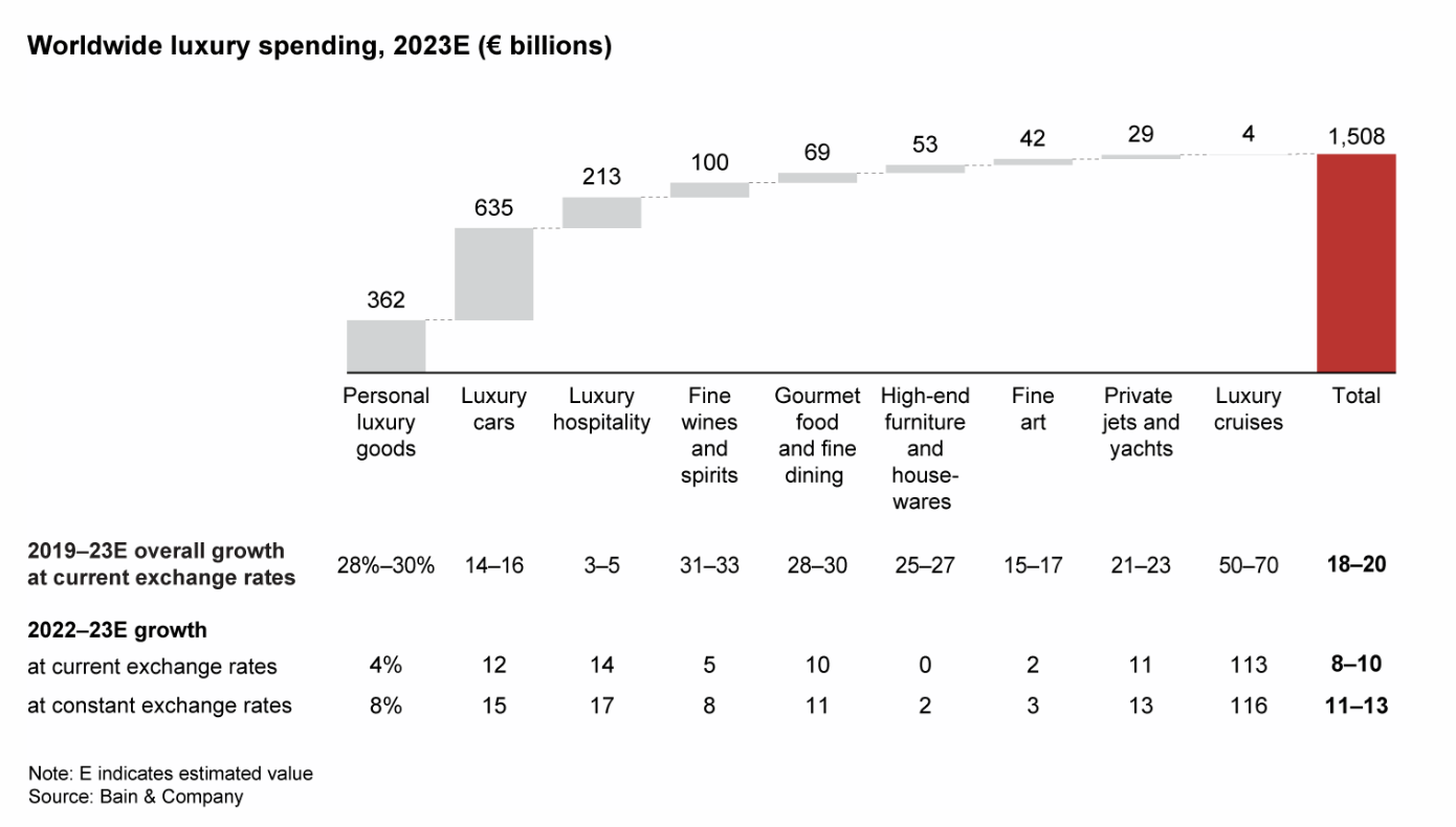 这份报告追踪的奢侈品领域包括个人奢侈品和高端体验,并被划分成了九个细分市场(豪华汽车、个人奢侈品、豪华酒店、高级葡萄酒和烈酒、美食和精致餐饮、高端家具和家居用品、艺术、私人飞机和游艇、豪华邮轮)。