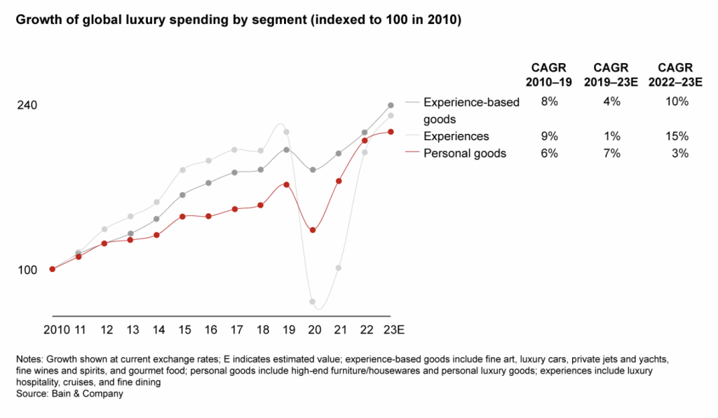 报告还指出,若按商品与体验进行细分,2023年消费者的支出在2023年逐渐向体验类消费平衡。由于消费者受到对社交生活和旅行的渴望的驱动,对奢华体验的需求达到历史最高水平,超越了对产品本身的关注。市场观察显示,体验类支出增长最为迅猛,达到15%,同时,以体验为基础的商品(如艺术品和豪华汽车),增长率为10%,而其他产品类支出的增长率为3%。
