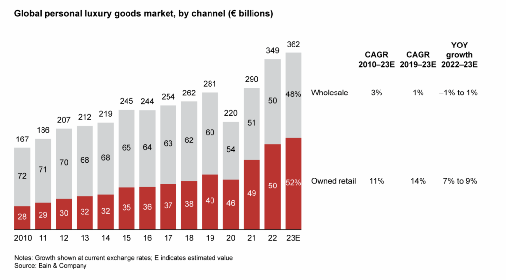2023年,品牌继续对其分销施加更多控制,直营渠道的重要性再次增加。零售渠道的份额首次超过批发渠道,分别为52%和48%。