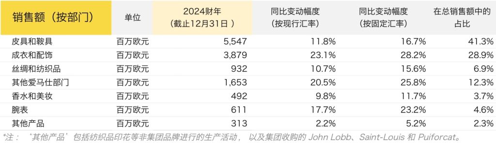 得益于成衣和鞋类产品系列的成功,成衣和配饰部门实现了28%的强劲增长。爱马仕2024年春夏男装系列和女装系列分别在6月和9月的时装秀上亮相,大受欢迎。