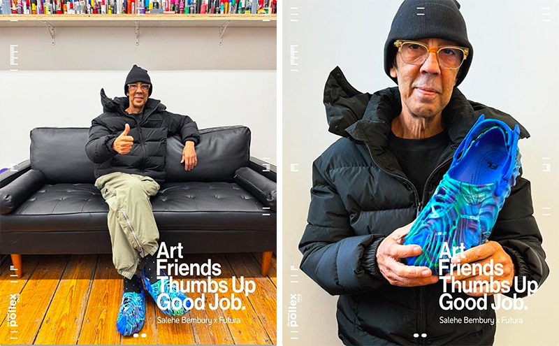 Crocs 和 Salehe Bembury 合作打造的 Pollex Clog 是近两年最炙手可热的鞋款之一,日前双方找来街头大师 FUTURA 围绕这一鞋款展开了特殊合作。三方打造了一款限定 1000 双的天蓝色涂鸦版本 Pollex Clog,在一体指纹鞋身上加入了涂鸦图案和渐变元素,后跟的提环也有强调身份的 logo 加持,细节满满。