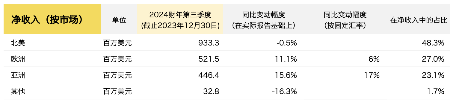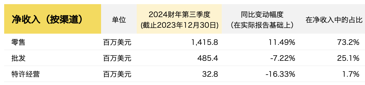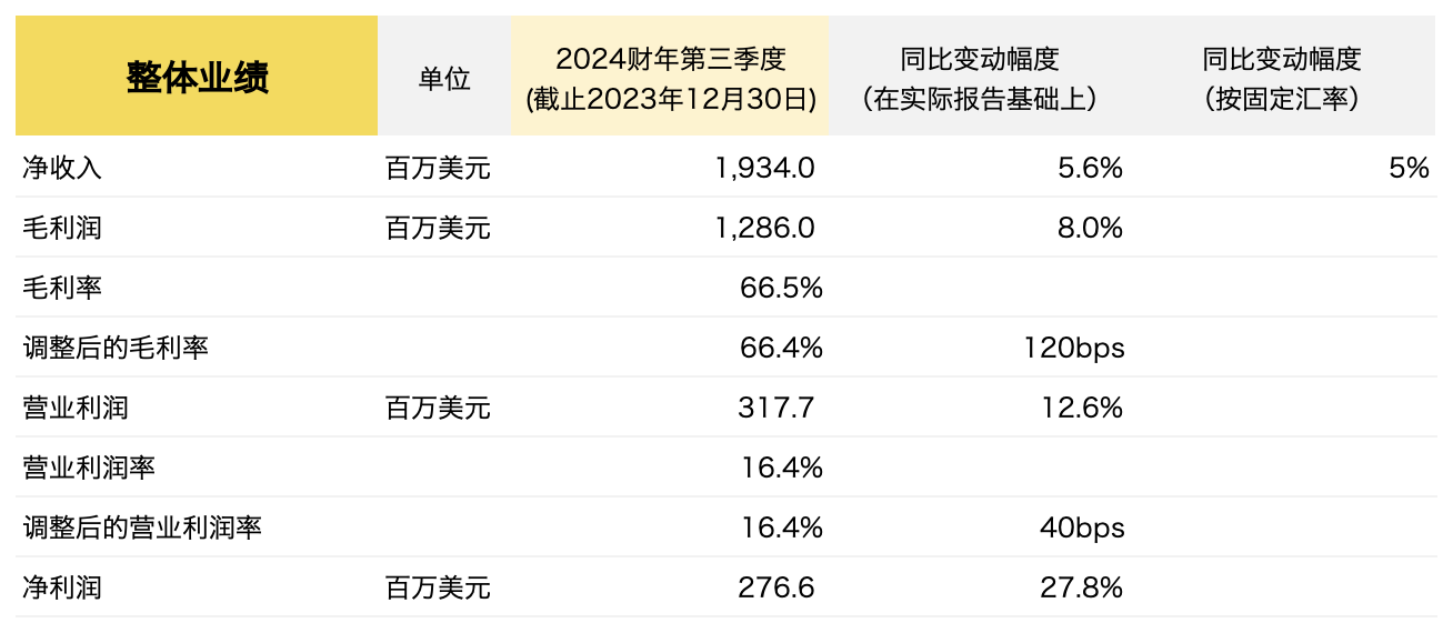 截至2023年12月30日,Ralph Lauren 2024财年第三季度的主要财务数据如下: