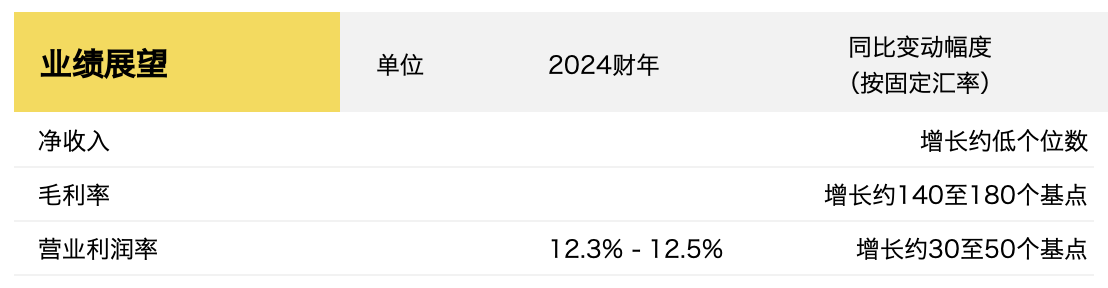 由于货运成本降低、有利的渠道和地理组合以及 AUR 的持续增长将足以抵消产品成本通胀,集团预计2024财年毛利率按固定汇率计算预计将增加约140至180个基点(之前为120至170个基点)。基于此,集团更新了2024财年业绩展望: