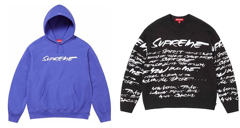 另外一些“熟面孔”的合作款也值得重点关注。首先是涂鸦艺术家 FUTURA 的合作款,FUTURA 专门为 Supreme 设计了多组图案,主打他极具辨识度的手写体设计,具体单品包括 Box Logo T 恤、连帽卫衣、毛衣、派克大衣、滑板、巴拉克拉法帽以及 New Era 三方联名的帽子。