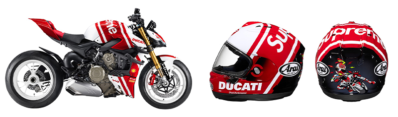 联名配件这块本季最重磅的是和意大利摩托车品牌杜卡迪 Ducati 共同打造的 Streetfighter V4 S,双方还有联手 Arai 带来 Corsair-X 头盔。另外还有电子乐器制造商罗兰 Roland 的 JU-06A 合成器和 TR-08 鼓机。