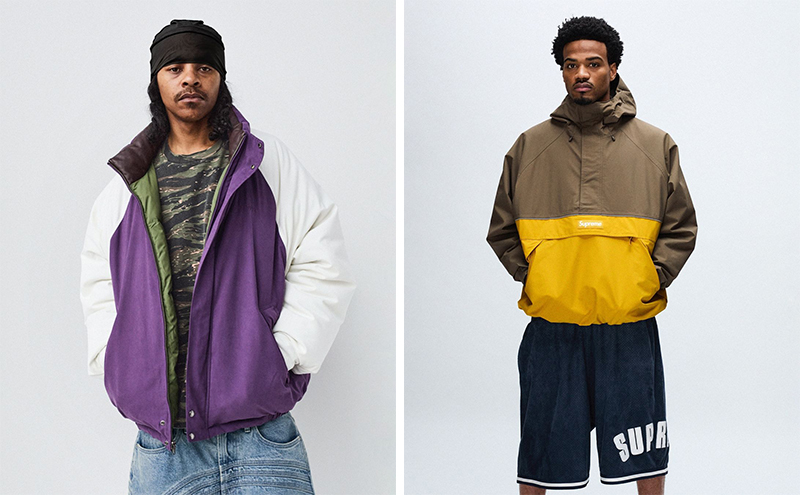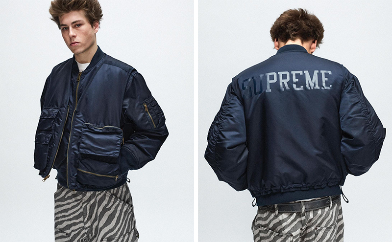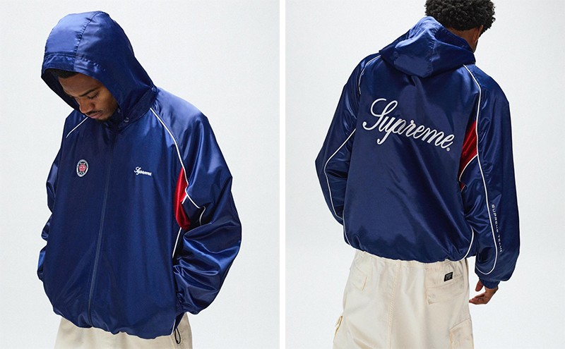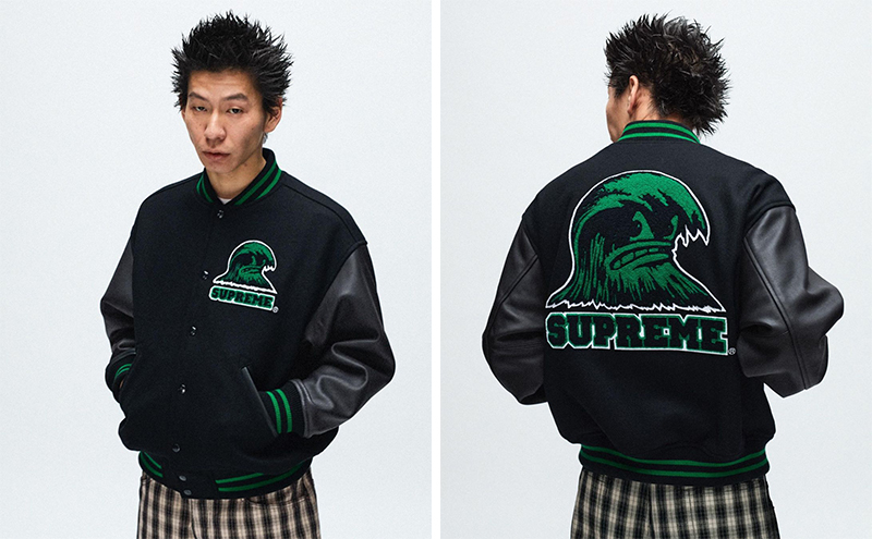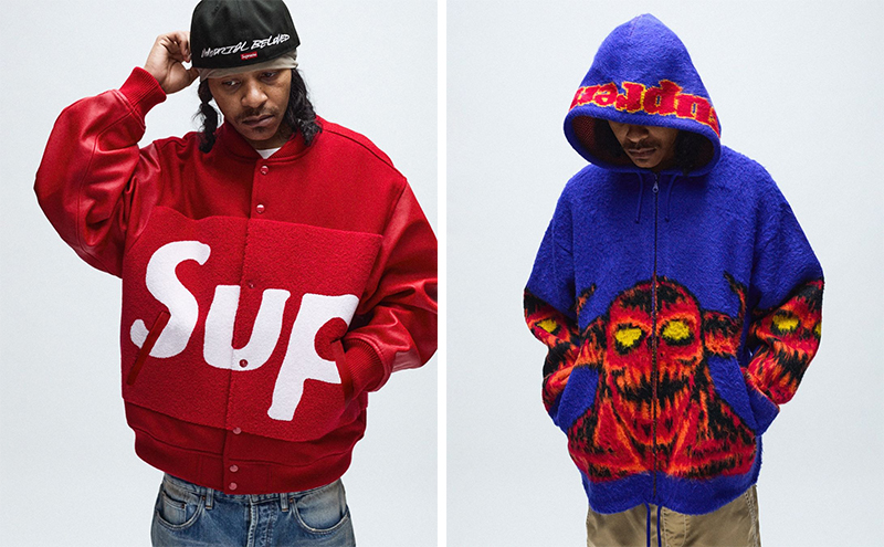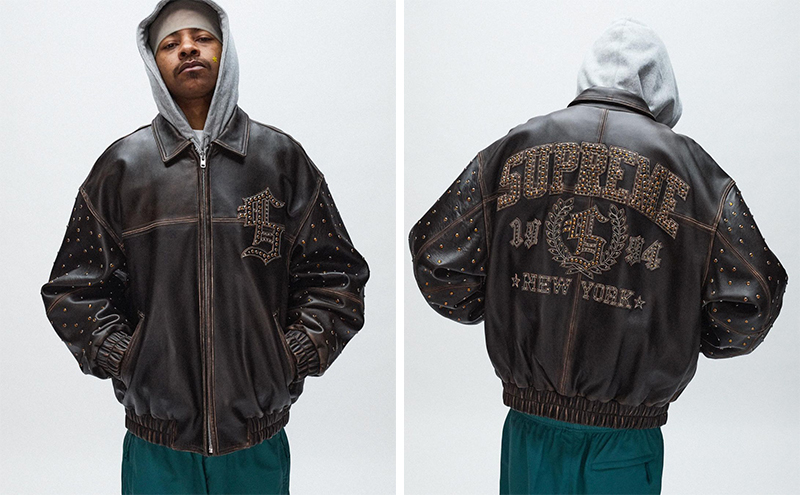整体看下来,Supreme 这季在外套上还是有不少靠谱的设计,比如 Cactus Plant 合作款雪尼尔夹克、S logo 拼布牛仔夹克、RealTree 合作的双面夹克、铆钉装饰的皮夹克、二合一背心加持的飞行员夹克、复古缎面运动夹克等。