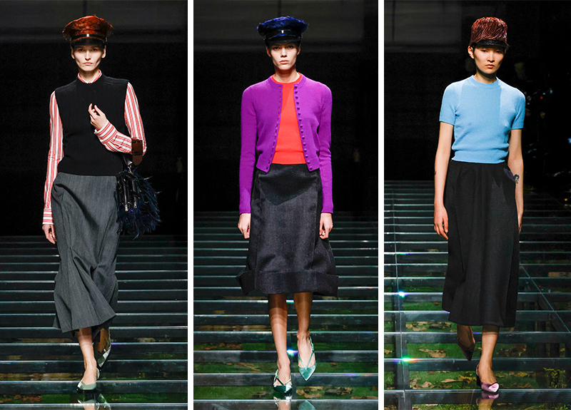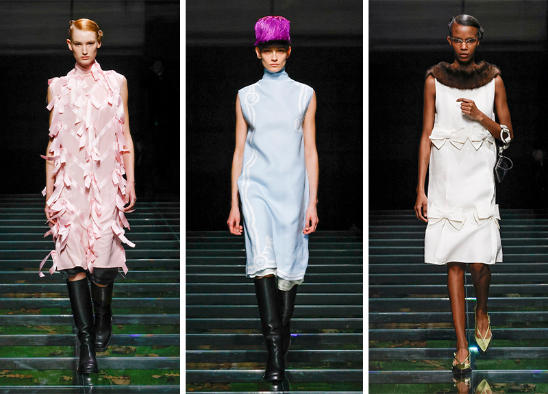 服装也似曾相识,这份熟悉感来自 3 个角度,其一是可以看到 Miuccia Prada 及 Raf Simons 各自以往设计的影子;其二是有多款和 2024 秋冬男装秀相呼应的造型,比如草绿和嫩粉搭配的针织衫;其三则是大量的经典款以看似最正经的姿态出现在秀场上。