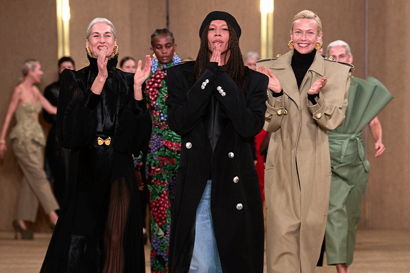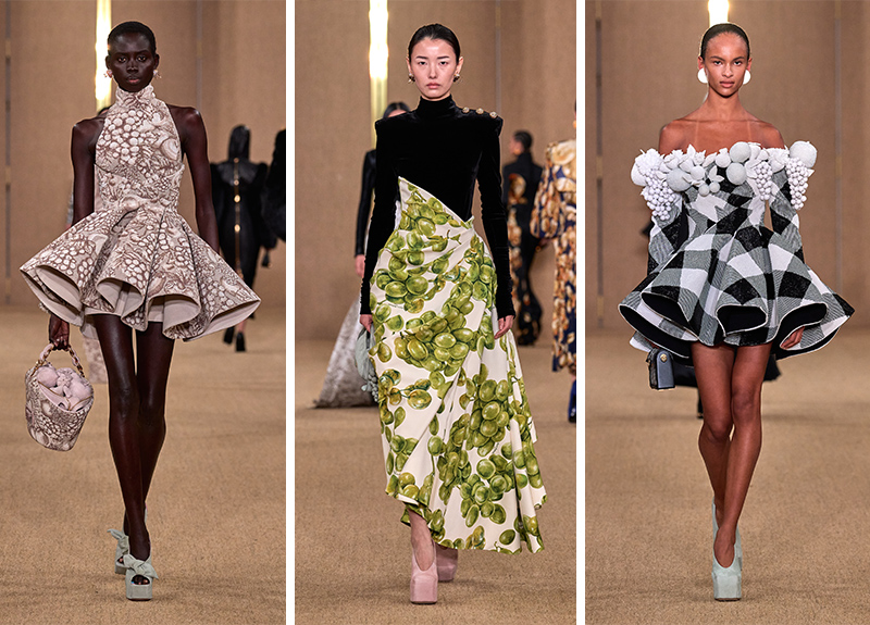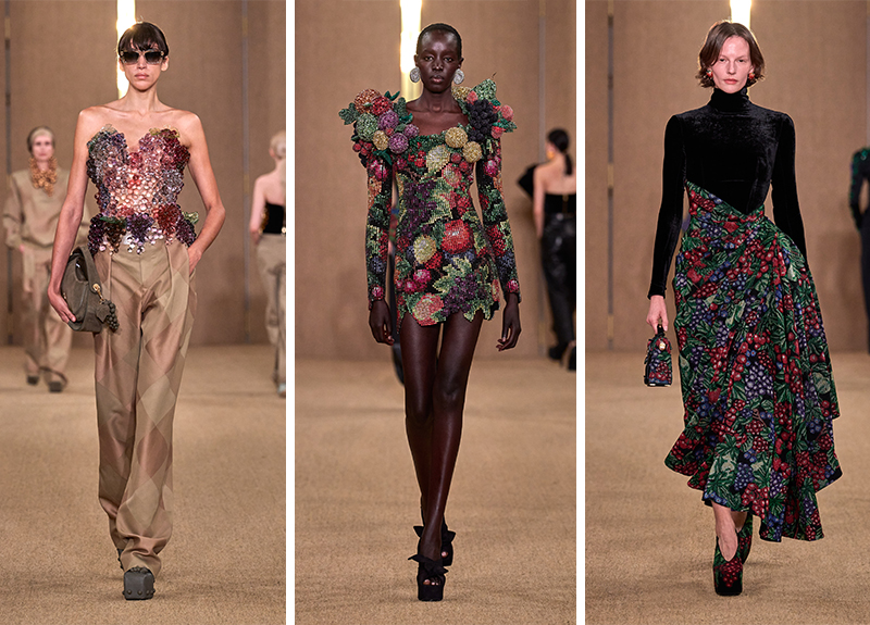 继 2024 春夏的玫瑰元素后,BALMAIN 创意总监 Olivier Rousteing 本季将目光聚焦了品牌创始人钟爱的另一个自然主题——花园中的果实,Rousteing 选择以自己家乡波尔多最著名的水果葡萄作为整个系列的主打元素。和之前的玫瑰一样,葡萄以多种工艺呈现在服装和配饰之上。