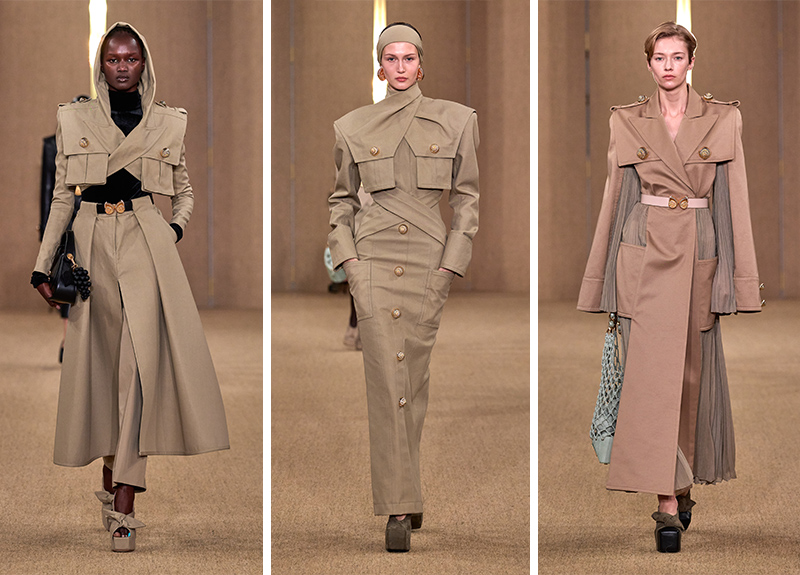 受波尔多雨季的启发,风衣成为本季的一个核心单品,除了经典的表达,Rousteing 也对其进行了重塑。风衣被切割为短夹克和伞裙,结合缠绕设计变身紧身长裙,通过拼接薄纱风琴褶赋予其全新的外观。