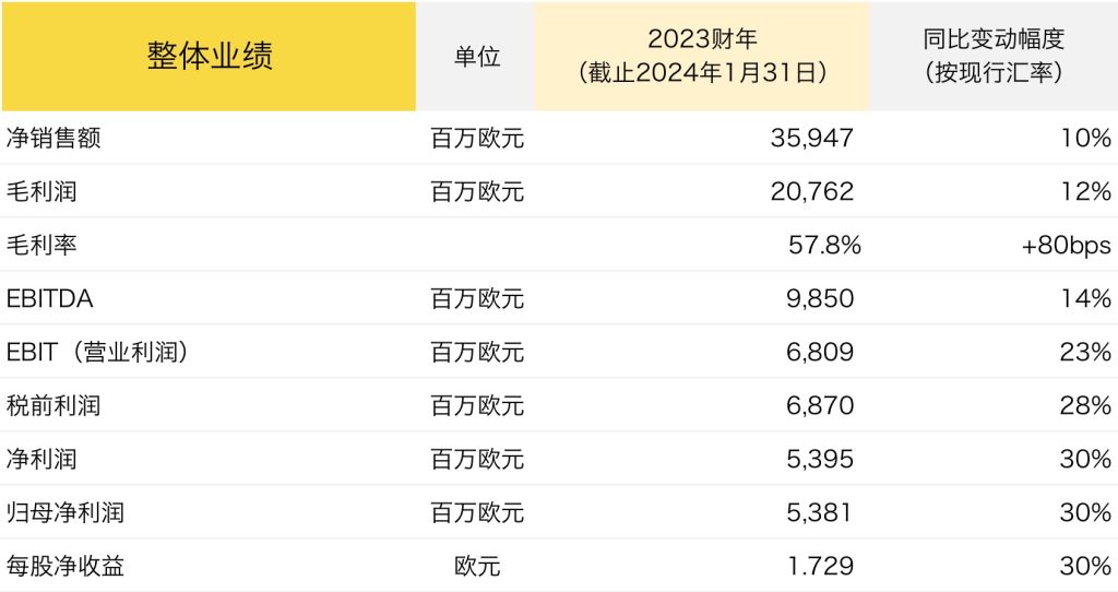 截止2024年1月31日,Inditex 集团的2023财年关键财务数据如下: