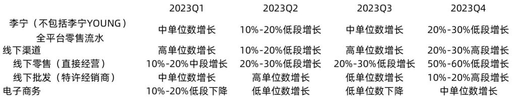从零售流水看,李宁集团在第三季度各渠道均有所下滑,但在第三季度均有所回升,线下零售(直营)渠道更是实现50%-60%的增长。