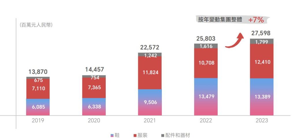 2023年,鞋类营收同比下跌0.7%至133.89亿元,为集团贡献48.5%的营收(2022年:52.2%),服装营收同比增长15.9%至124.11亿元,占比由41.5%提高至45.0%。