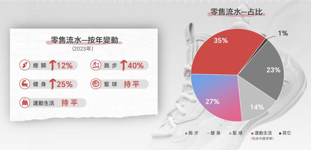 财报显示,篮球、跑步、健身、羽毛球以及运动生活五大核心品类2023年全渠道零售流水均实现正增长,总额同比增长12%,其中跑步品类同比增长40%表现最佳,运动生活(包含中国李宁)则依然为集团贡献最大的零售流水,占比达35%。