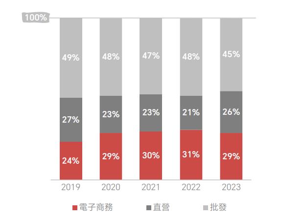 从渠道看,2023年直营营收同比增长29.6%,表现最佳(电子商务平台营收同比略增0.9%,批发营收同比略增0.6%)。直营渠道营收占比也达到26%,此前三年均低于25%,2022年则只有21%。