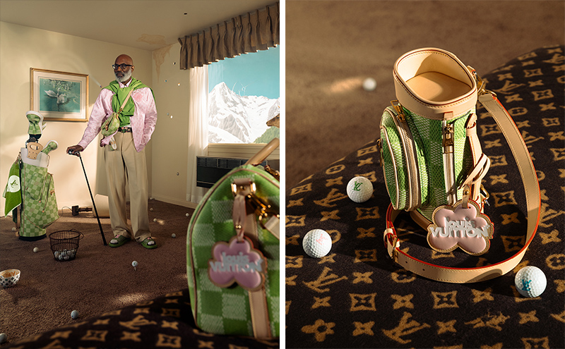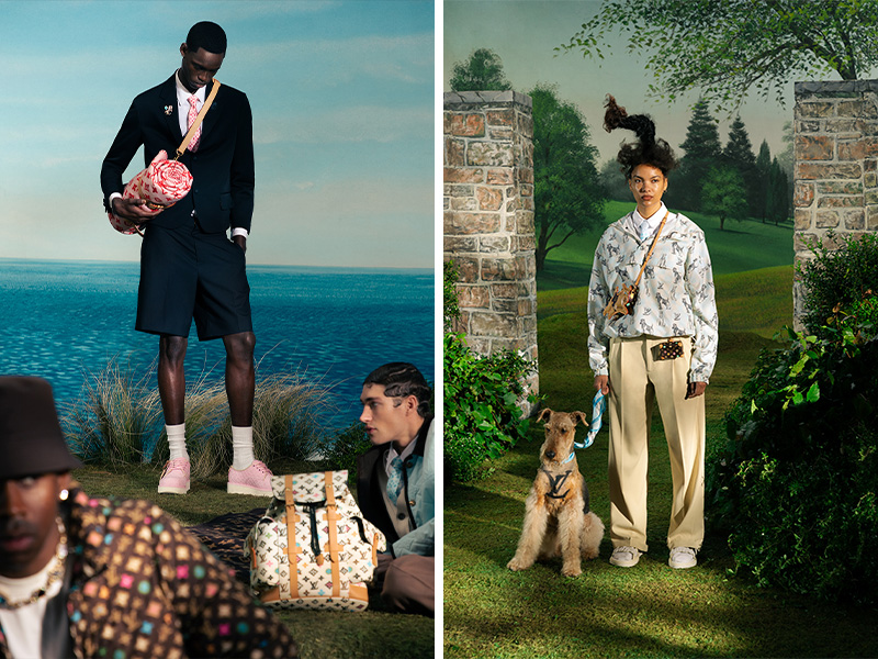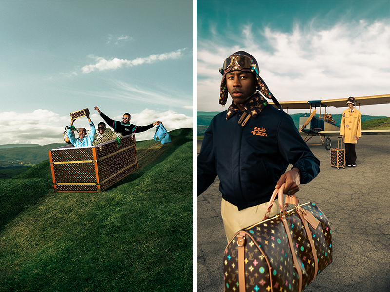 同时 Tyler, The Creator 重塑了 Monogram 和 LV logo,由他亲自手绘的 Craggy Monogram 图案成为本季标识,另外融入雏菊和梗犬造型的 LV Flowers 图案也是一个亮点。