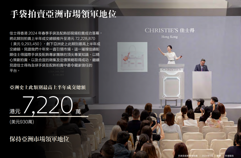 根据佳士得香港本月公布的2024年春季拍卖最新数据,奢侈品春季现场拍卖总额突破 7.95亿港币 / 1.024亿美元。其中以爱马仕为代表的手袋及配饰上半年拍卖总成交额7200万港元/930万美元,创亚洲有史以来该类别最高上半年成交纪录。