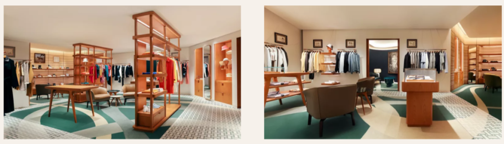 内部共分三层,在爱马仕标志性的希腊式琉璃球顶灯映衬下,一楼的藏书章图样马赛克唤起了人们对海岛上沙滩和海浪的回忆。爱马仕的全线16个产品品类错落有致地分布其中。