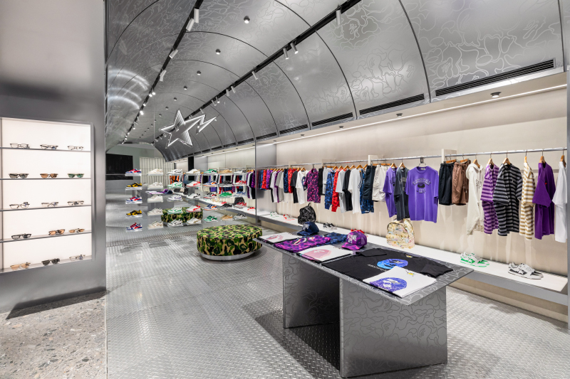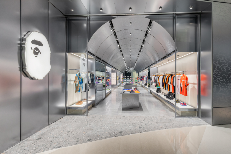 沈阳万象城 BAPE STORE 重装亮相。2015 年 BAPE 就在沈阳万象城开出了门店,这次店铺换到了沈阳万象城三期全新亮相。 店铺设计延续了 BAPE 全球专门店一致的未来科幻美学,整体以香槟金和太空银双色调打造出时尚氛围,正门不锈钢墙体覆盖了 LINE CAMO 迷彩图纹,橱窗则集结了“SHARK SEIJIN 鲨星人”雕塑阵列和猿人迷彩显示屏。而室内更是首次采用了仿佛时空隧道的弧形天花板设计,也进一步提升了探索的沉浸感。