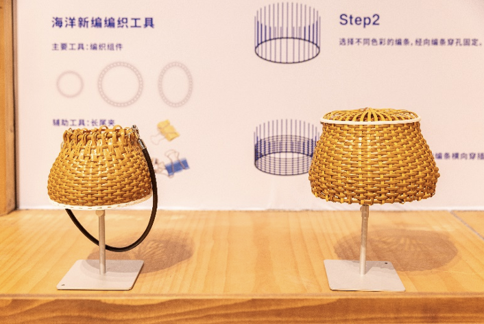 海洋新编项目是提案 MUJI CYCLE 结合 OBP 编织工艺,希望开发⼀套兼具器物⻣架功能的模块化编织组件。搭载现有的 OBP 编织条,从传统的⺠族加⼯⽅式中汲取灵感,将在地化的传统⼯艺融⼊到再⽣材料的造物过程中,同时达到简化编织⼯序,促进绿⾊⽣态和在地⽂化的双重可持续发展。