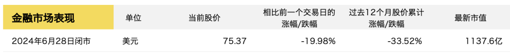 财报发布后的第二天,截至6月28日收盘,Nike公司股票较上一交易日下跌19.98%至75.37美元/股,当前市值约为1137.6亿美元。