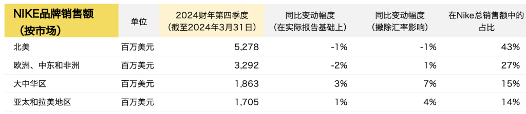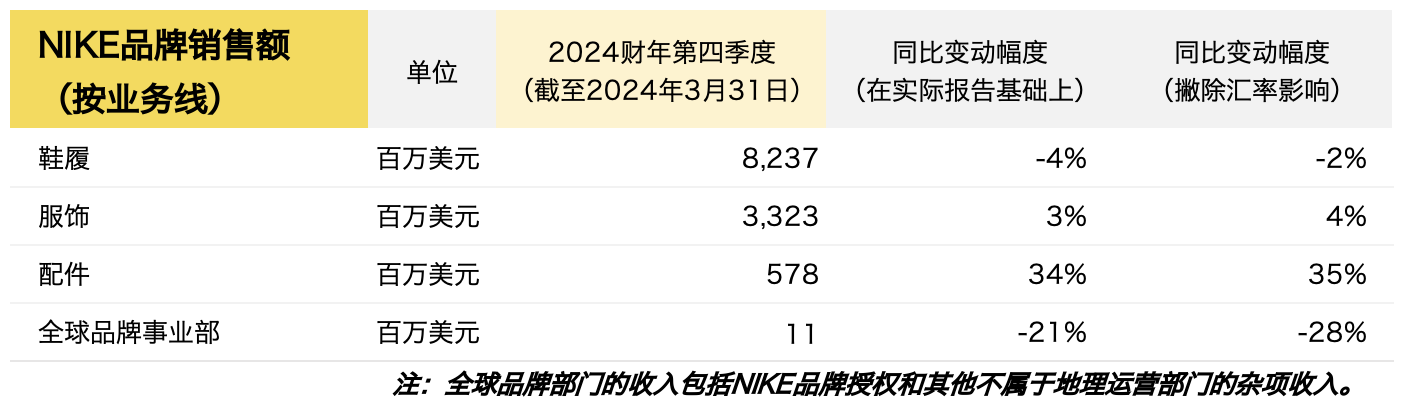 截至2024年3月31日,Nike 2024财年第四季度主要财务数据如下:
