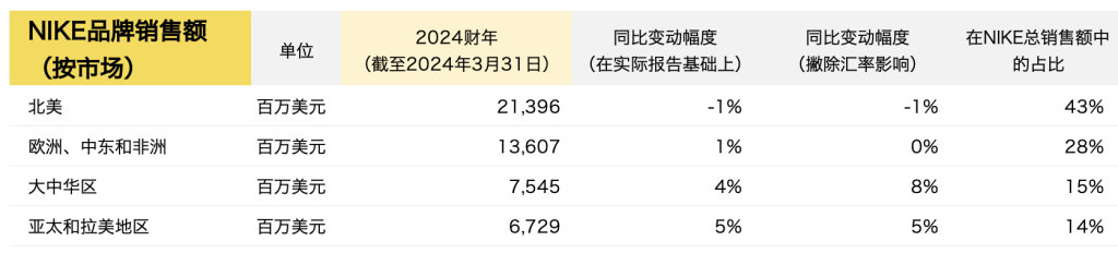 就 Nike 品牌而言,大中华区全年总营收达75亿美元,按固定汇率计同比增长8%;第四季度营收19亿美元,同比增长达7%,全财年四个季度均实现增长,也是连续第七个季度实现增长。