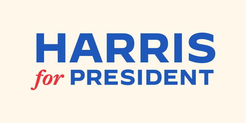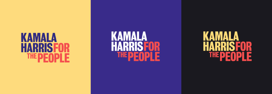 比如哈里斯版的竞选标志就直接延续了之前“拜登-哈里斯”组合的设计,奶白色背景上用的是蓝色无衬线字体 Decimal,同时以红色点缀。而拜登的名字被去掉,哈里斯的名字被凸显,因为还没成为正式候选人,也没有选择副手,第二排就用来强调要参与总统竞选的信息了。