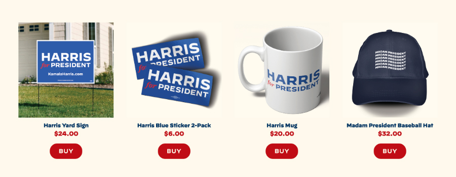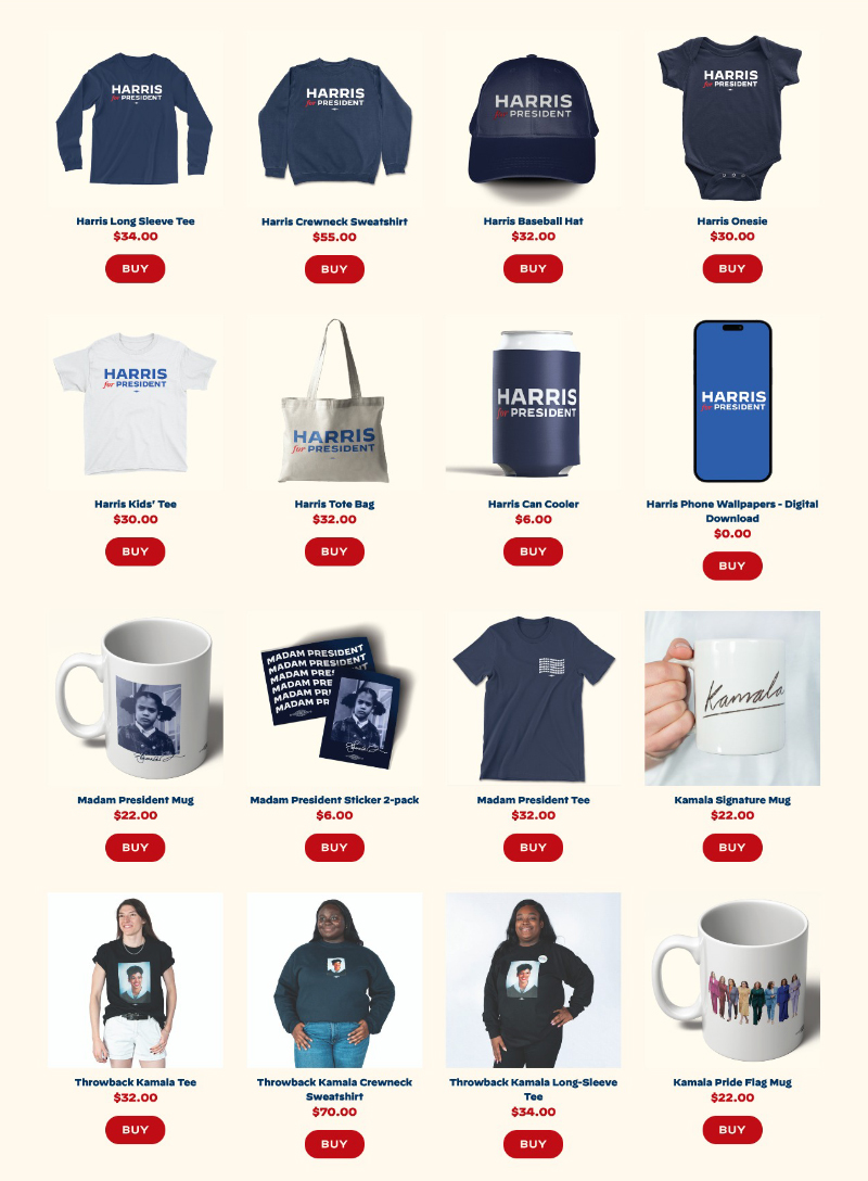 回到这次的竞选。除了推出“后拜登时代”的竞选标志,就连原来的官方周边商品网站上(甚至域名还是 shop.joebiden.com),也是拜登相关的产品全部下架,一系列采用哈里斯新版竞选标志的周边放在了最显眼位置。
