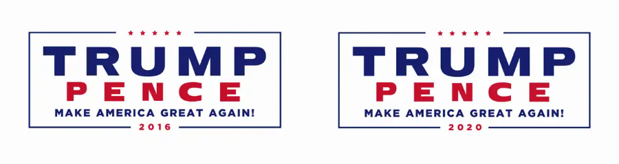 甚至于特朗普的这套视觉已经持续多年,从他 2015 年宣布参加 2016 年美国大选时就是这一套,后来参加 2020 年美国大选时也没改过(不过拜登这边是有改动的,把名字里的“e”换成红白飘带以及用 Decimal 字体都是上届时就有的设计,但整体呈现有比较大的不同)。