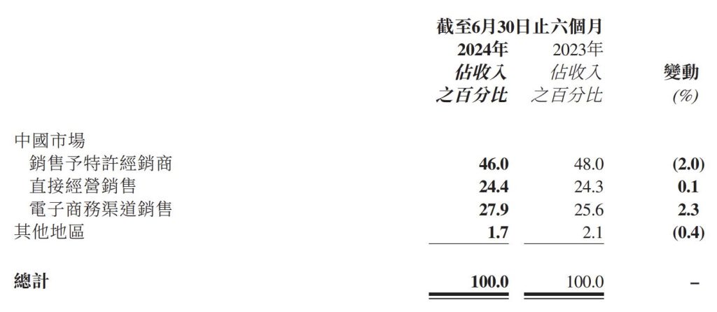 为保证渠道存货的健康,公司强化经销商发货节奏管理,销售予特许经销商营收同比略降2.0%。