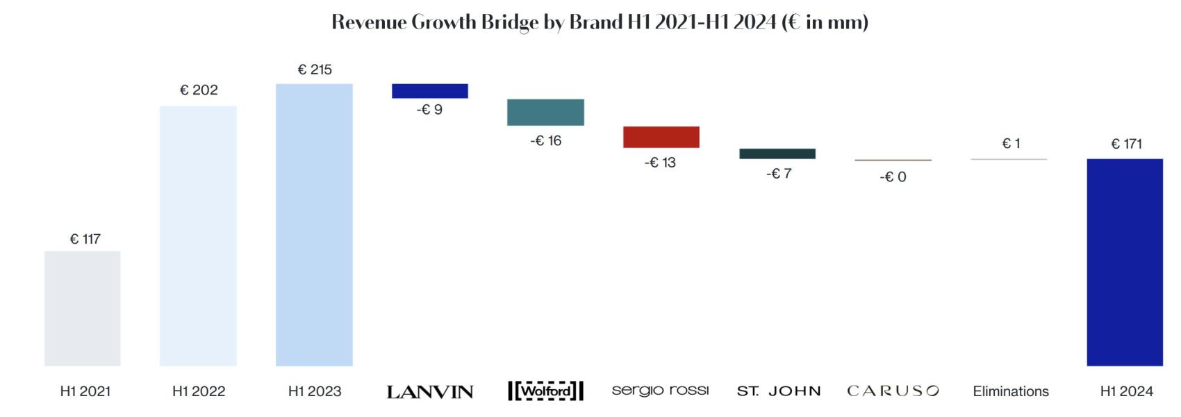 纽约当地时间8月26日开盘前,全球时尚奢侈品集团 Lanvin Group(复朗集团)(纽交所代码:LANV)公布2024上半年财报:集团实现营收1.71亿欧元,较 2023年同比下降20%。集团经调整 EBITDA 相较于去年同期下降3%至亏损4211万欧元。复朗集团旗下品牌包括 Lanvin、 Wolford、Sergio Rossi、St. John 和 Caruso。