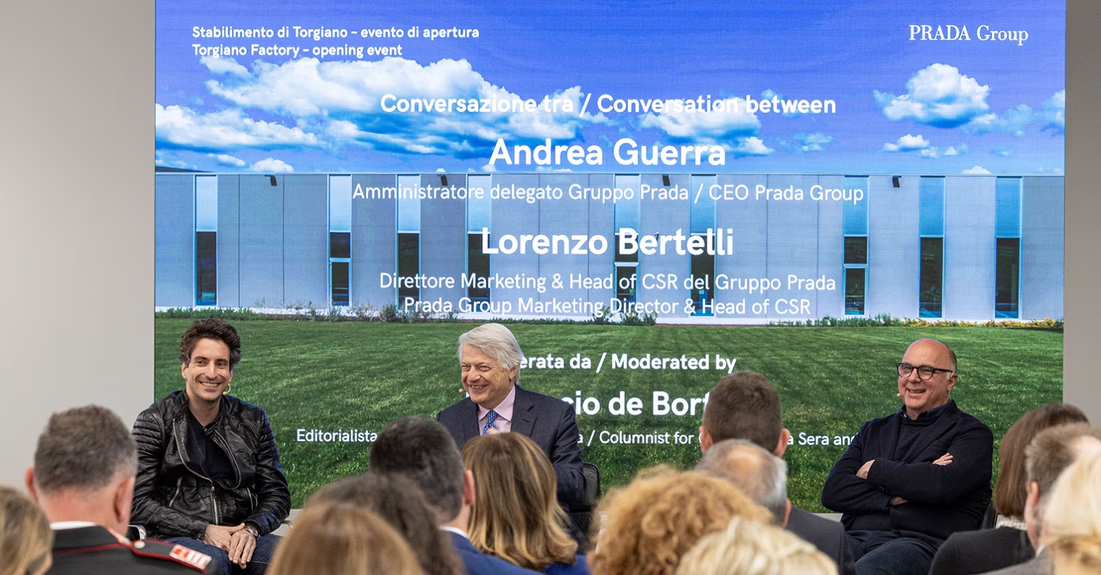 上图:(从左至右)Prada集团企业社会责任负责人 Lorenzo Bertelli、首席执行官 Andrea Guerra、董事长 Patrizio Bertelli