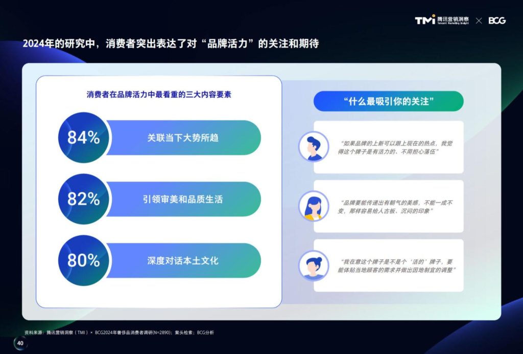 引领审美和品质生活、与当下大势有所关联、与本土文化深度对话,是消费者在品牌活力中最看重的三大内容要素。