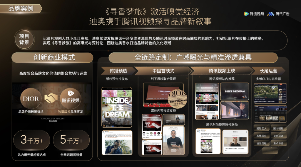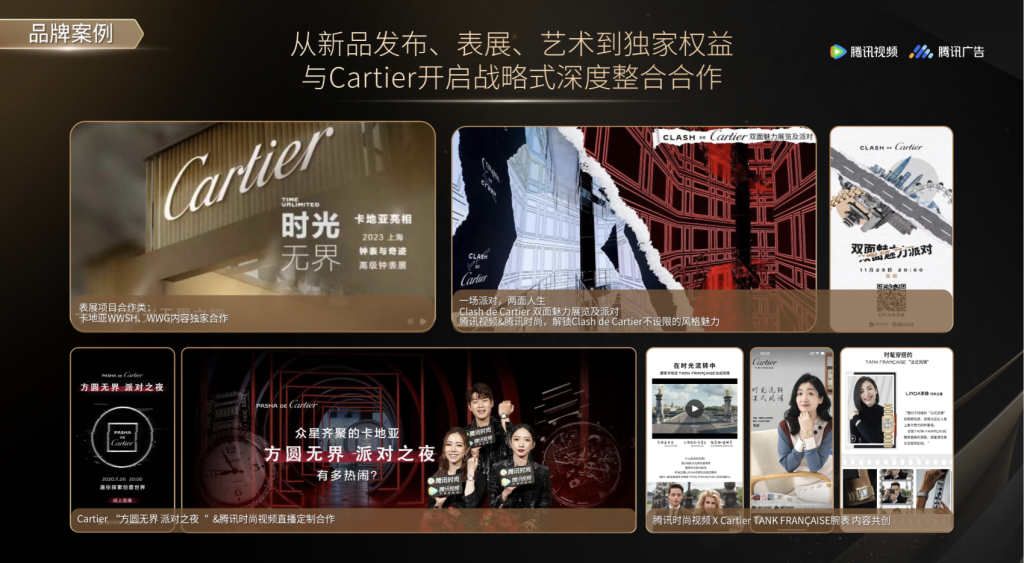 而在上文提到的两个案例中,迪奥纪录片《寻香梦旅》覆盖了微信视频号预热、腾讯视频独播版权、媒体内容报道支持的全链路定制。卡地亚则为“百年经典,隽永风格”主题大展打造了行业首个视频号+小程序双触点直播引流。品牌可以同时调动内容场和社交场的优势资源。