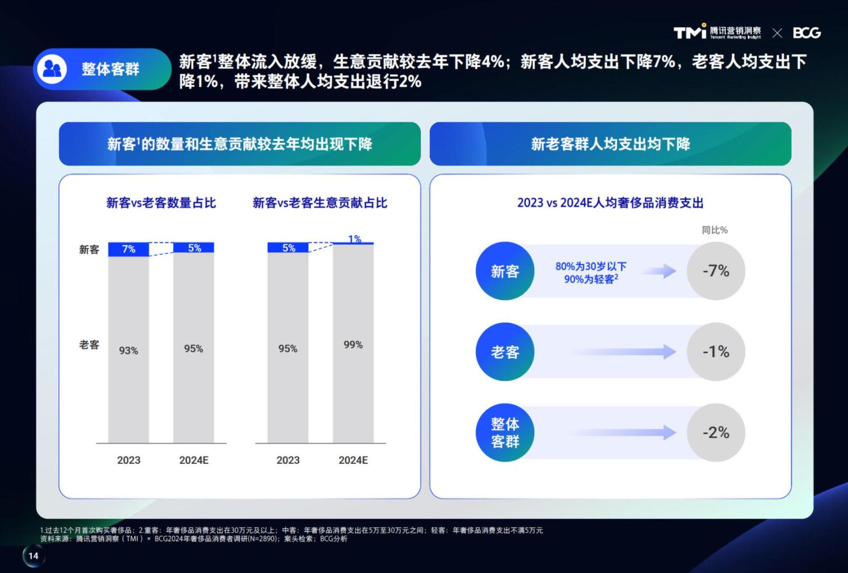 过去一年间,新客整体流入放缓,生意贡献较去年下降4%,新客人均支出下降7%,老客人均支出下降1%,带来整体人均支出退行2%。在当前保有客户中,重客人群支出同比增长12%,而45%的中客开支下降。