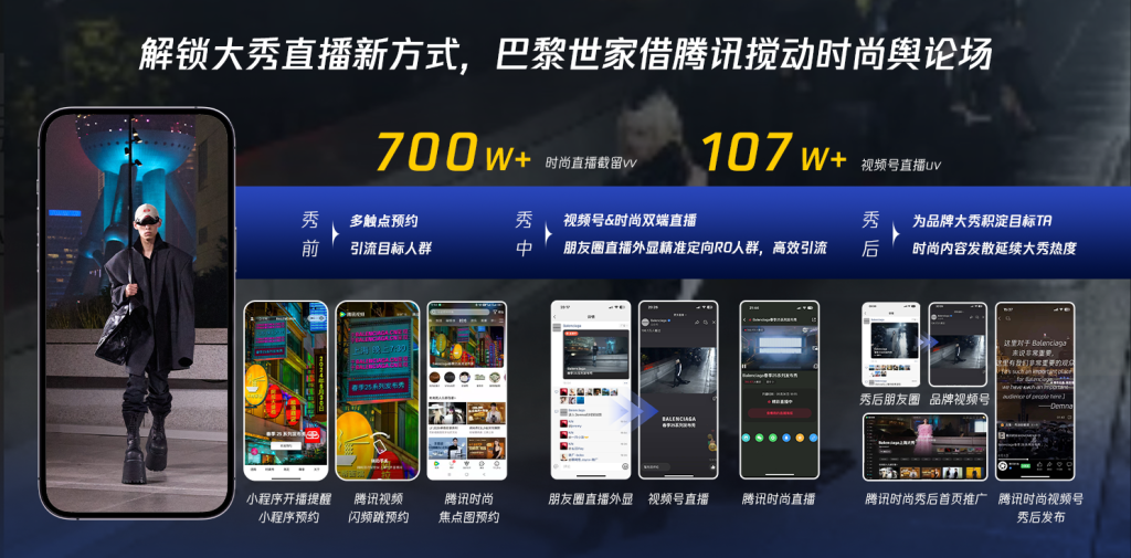 巴黎世家春季25系列大秀腾讯时尚直播截留700万+播放量,视频号直播107万+浏览。
