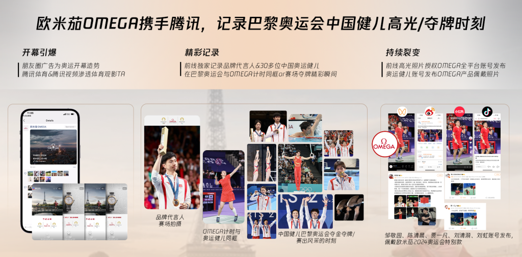 奥运开幕阶段,欧米茄通过朋友圈广告造势,通过腾讯体育、腾讯视频渗透体育观众。赛事期,由腾讯前线独家记录30多位中国奥运健儿与欧米茄计时的同框瞬间。奥运健儿账号发布欧米茄产品佩戴照片后,在朋友圈、视频号及其他全平台账号持续裂变。