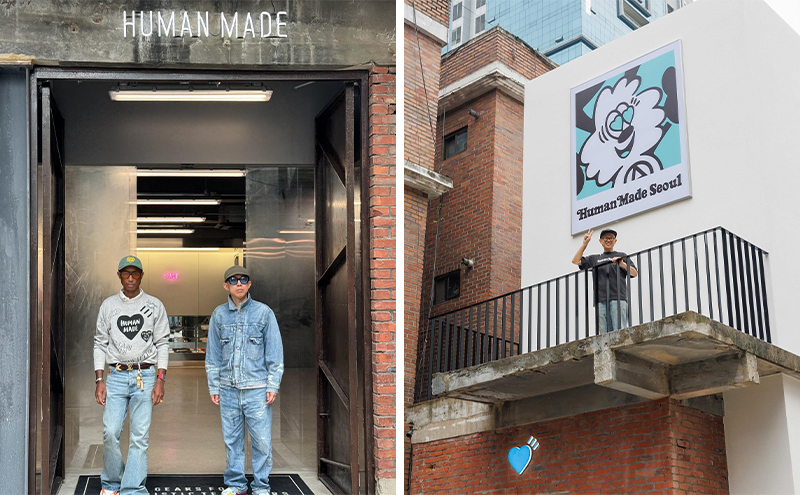 左边是 NIGO 和 Pharrell Williams(1 月刚被任命为 HUMAN MADE Inc. 的顾问)合体亮相 HUMAN MADE 韩国旗舰店,右边是 VERDY 在门店和自己创作的海报合影