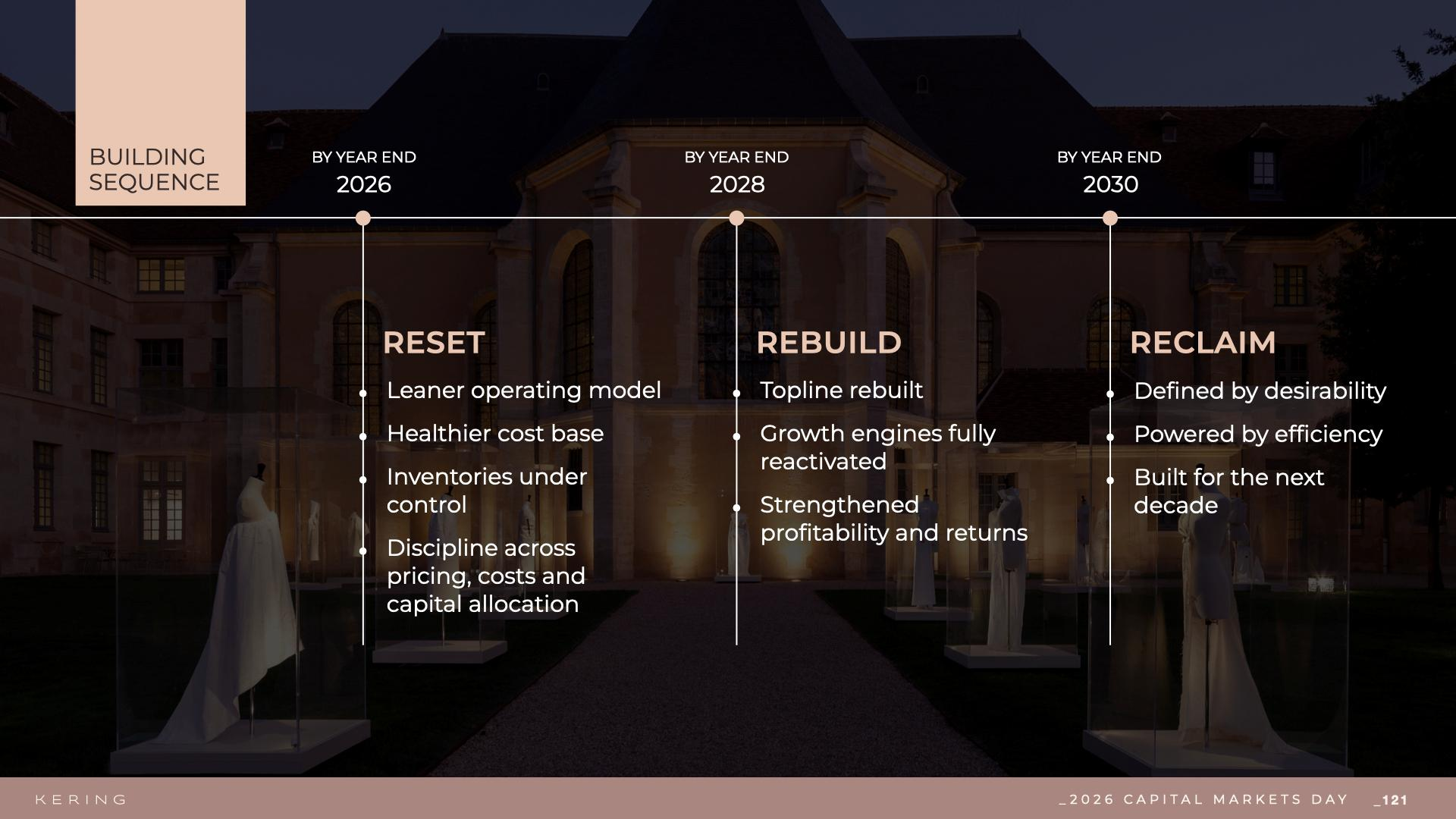 - 重夺(RECLAIM,至2030年底):凭借效率和吸引力,重新确立作为“下一代奢侈品(Next Luxury)”领域标杆玩家的地位。