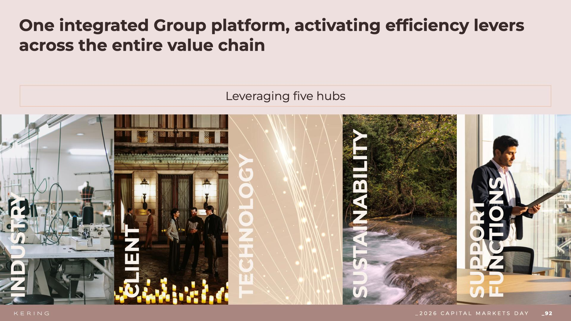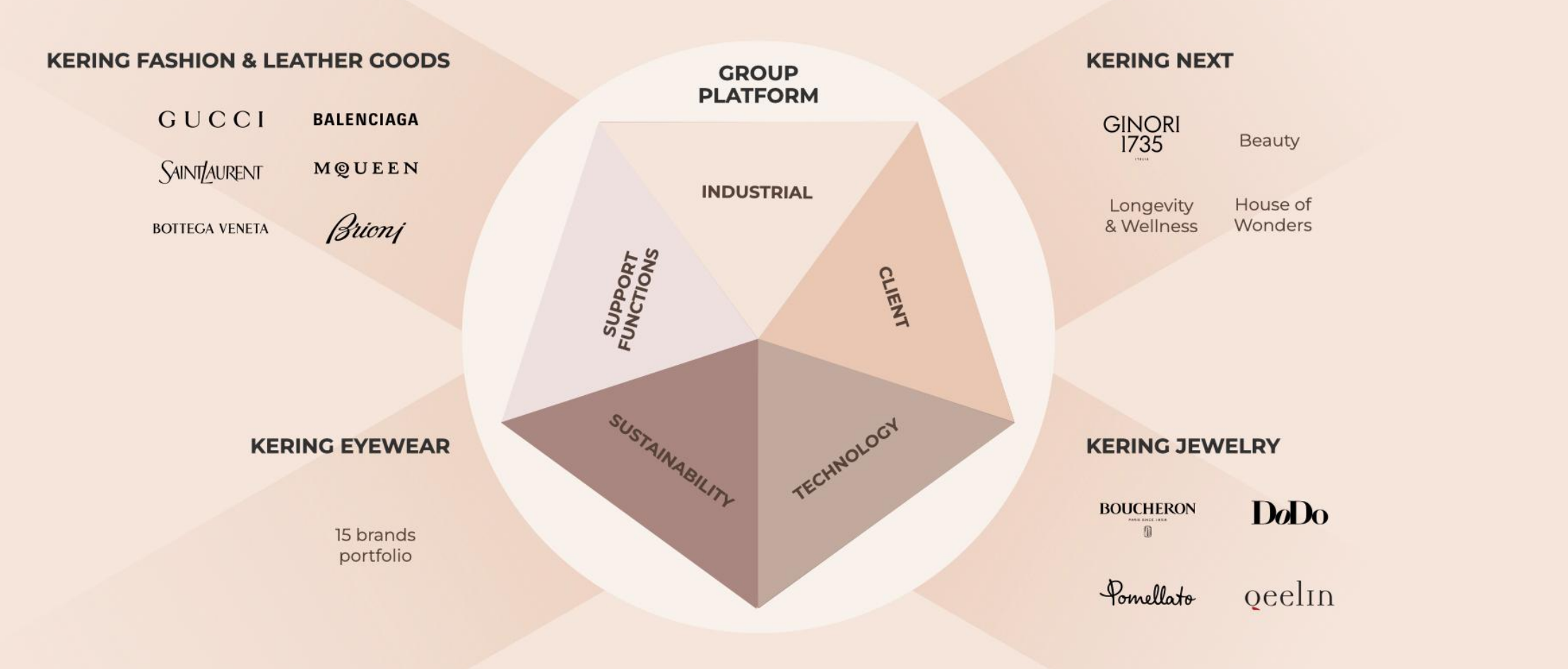 为了使各品牌以更强大的力量、速度和效率运营,开云集团构建了包含五个中心的集团赋能平台: