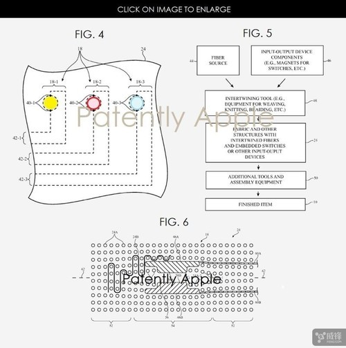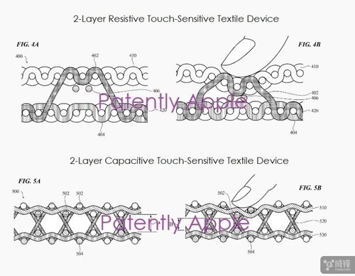 苹果公司这三项专利之一所提到的智能面料,涵盖了以服装、钱包、口袋等形式下使用的智能穿戴面料。其触敏按钮嵌入编织纤维内部。触敏纺织装置可以固定在纺织物中,并以带状或者绳状的形式,植入衬衫、夹克、手套和其他纺织品服饰中。在实施方案中,电子产品可以识别触敏纺织装置上的触摸手势,并能接收纺织物上的触摸指令和用户输入。